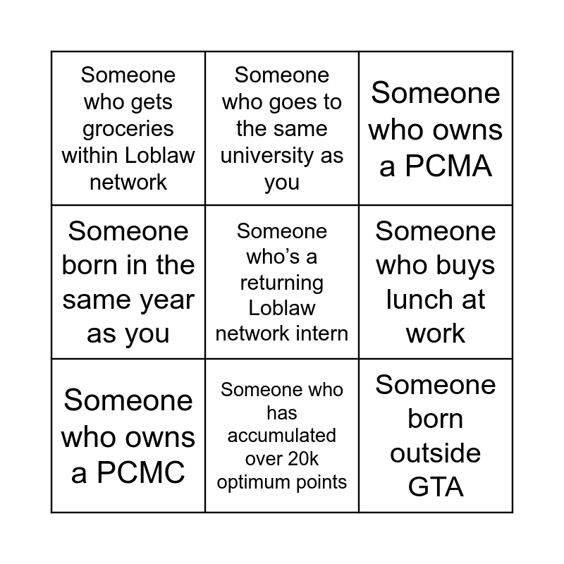 This bingo card has 9 words: Someone who owns a PCMC, Someone who owns a PCMA, Someone who goes to the same university as you, Someone born in the same year as you, Someone who gets groceries within Loblaw network, Someone who buys lunch at work, Someone who’s a returning Loblaw network intern, Someone born outside GTA and Someone who has accumulated over 20k optimum points.