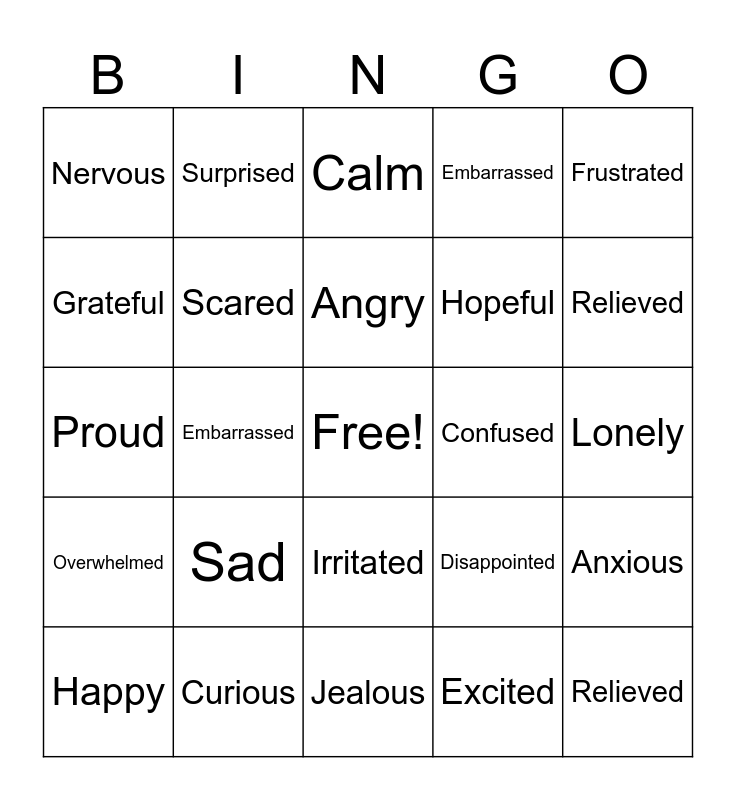 This bingo card has a free space and 24 words: Happy, Sad, Angry, Excited, Frustrated, Nervous, Surprised, Calm, Confused, Lonely, Proud, Scared, Disappointed, Anxious, Grateful, Curious, Jealous, Embarrassed, Relieved, Overwhelmed, Embarrassed, Irritated, Hopeful and Relieved.