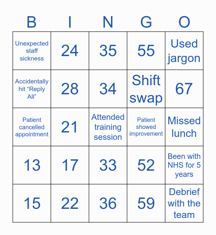 This bingo card has 126 words: 1, 16, 31, 46, 61, 2, 17, 32, 47, 62, 3, 18, 48, 63, 4, 19, 33, 49, 64, 5, 20, 34, 50, 65, 6, 21, 35, 51, 66, 7, 22, 36, 52, 67, 8, 23, 37, 53, 68, 9, 24, 38, 54, 69, 10, 25, 39, 55, 70, 11, 26, 40, 56, 71, 12, 27, 41, 57, 72, 13, 28, 42, 58, 73, 14, 29, 43, 59, 74, 15, 30, 44, 60, 75, 45, Back-to-back meetings, Patient arrives unannounced, Raised safeguarding concern, Helped a colleague, Debrief with the team, Smart card not working, Mental Health Act assessment, Referral not appropriate, Managed a crisis, Missed lunch, Fire alarm test, Incomplete admin, IT issues, Supervision cancelled, Documented an incident, Finished work late, On duty today, Joint visit, Shift swap, Been with NHS for 5 years, Unexpected staff sickness, Printer jammed, Attended MDT meeting, Depot and Clozapine clinic, Completed risk assessment, Patient cancelled appointment, Provided psychoeducation, Attended training session, Discussed care plan, Reviewed medication chart, Recorded patient notes, Delivered group therapy, Attended clinical supervision, Patient showed improvement, Managed difficult conversation, Coordinated with social services, Completed discharge planning, Signposted to community resources, Patient requested second opinion, Delivered CBT, Completed outcome measurement, Participated in service audit, Transfer of care, Referred to specialist service, Camera not working, Accidentally hit “Reply All”, Forgot to unmute, Per my last email…, Worked remotely, Used jargon and Re-zoned a patient.