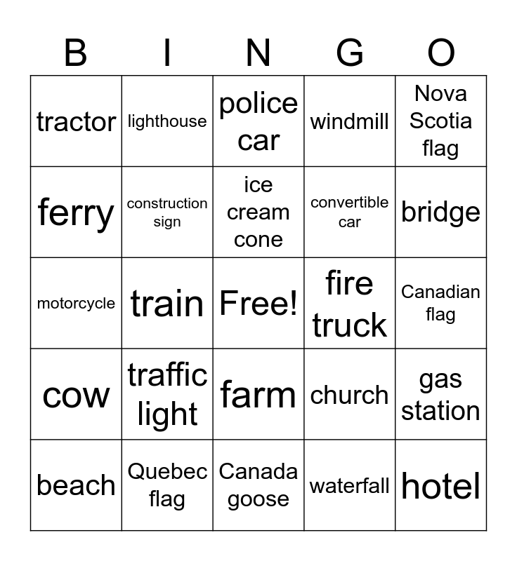This bingo card has a free space and 26 words: farm, waterfall, ice cream cone, Quebec flag, Nova Scotia flag, tractor, ferry, lighthouse, Canadian flag, church, convertible car, motorcycle, gas station, beach, train, motor home, windmill, cow, police car, hotel, bridge, Canada goose, fire truck, traffic light, construction sign and deer.