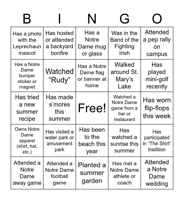 This bingo card has a free space and 62 words: Visited the Golden Dome, Attended a Notre Dame football game, Taken a photo at the Grotto, Owns Notre Dame apparel (shirt, hat, etc.), Had a class in DeBartolo Hall, Eaten at the Morris Inn (Rohr's), Watched “Rudy”, Participated in a Notre Dame tailgate, Walked around St. Mary’s Lake, Attended a commencement ceremony at ND, Was in the Band of the Fighting Irish, Visited the Basilica of the Sacred Heart, Has a Notre Dame bumper sticker or magnet, Watched a game at the Joyce Center, Was a member of a Notre Dame club or organization, Has a photo with the Leprechaun mascot, Attended a Notre Dame wedding, Attended a pep rally on campus, Participated in a Notre Dame service project, Has a Notre Dame flag or banner at home, Watched a Notre Dame game from a bar or restaurant, Has a Notre Dame mug or glass, Attended a Notre Dame away game, Has met a Notre Dame athlete or coach, Has studied in Hesburgh Library, Was a resident of a Notre Dame dorm (name your dorm), Has attended a Notre Dame reunion, Has a Notre Dame Christmas ornament, Has participated in “The Shirt” tradition, Has visited the Snite Museum of Art, Has been to a Notre Dame vs. USC game, Has participated in a Notre Dame alumni event, Has gone fishing or boating recently, Has attended an outdoor movie or drive-in this summer, Has worn flip-flops this week, Has hosted or attended a backyard bonfire, Has picked fresh fruit or berries this summer, Has gone paddleboarding or kayaking, Has made s’mores this summer, Has gone to a farmer’s market, Has tried a new summer recipe, Has seen a summer blockbuster movie, Has visited a water park or amusement park, Has completed a summer DIY project, Has played mini-golf recently, Has watched a sunrise this summer, Has been to a summer concert or festival, Has grilled or BBq'ed this summer, Has taken a summer trip, Has gone swimming this summer, Has been to the beach this year, Planted a summer garden, Has attended a summer wedding, Has gone camping or hiking this summer, Has a summer birthday, Has seen fireworks this year, Has played a summer sport (golf, tennis, etc.), Has a summer reading list, Has hosted or attended a picnic, Watched a sunsets, Has traveled somewhere new this summer and Has started a new hobby this summer.
