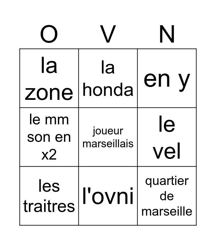 This bingo card has 9 words: les traitres, en y, la honda, le mm son en x2, la zone, le vel, joueur marseillais, quartier de marseille and l'ovni.