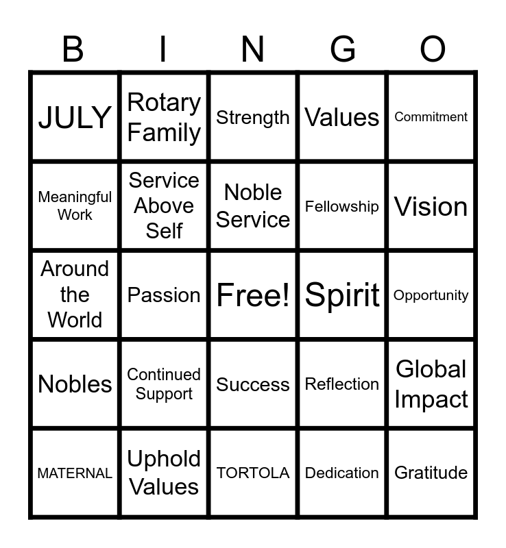 This bingo card has a free space and 55 words: HANWASH, MATERNAL, BABY, JULY, TORTOLA, Rotary, Service Above Self, Four-Way Test, Fellowship, Community, Values, Purpose, Leadership, Mentoring, Support, Legacy, Commitment, Passion, Engagement, Gratitude, Spirit, Unity, Reflection, Strength, Appreciation, Noble Service, Dedication, The Moorings, Opportunity, Global Impact, Local Impact, Positive Change, Collective Action, Lasting Meaning, Meaningful Work, Around the World, Momentum, Nobles, Auction, Installation Dinner, Rotary Family, Inspiration, Making a Difference, Greater Good, Continued Support, Uphold Values, Unite in Service, Celebration, Acts of Service, Vision, Encouragement, Participation, Empowerment, Success and “Nobles Were Birthed Here”.