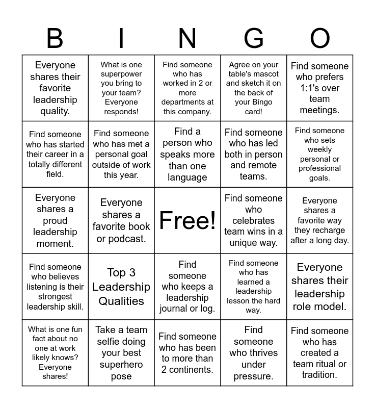 This bingo card has a free space and 24 words: Top 3 Leadership Qualities, Take a team selfie doing your best superhero pose, Find a person who speaks more than one language, What is one fun fact about no one at work likely knows? Everyone shares!, Find someone who prefers 1:1's over team meetings., Everyone shares their favorite leadership quality., Find someone who has started their career in a totally different field., What is one superpower you bring to your team? Everyone responds!, Find someone who celebrates team wins in a unique way., Find someone who keeps a leadership journal or log., Find someone who has led both in person and remote teams., Everyone shares a proud leadership moment., Find someone who has learned a leadership lesson the hard way., Everyone shares their leadership role model., Find someone who has met a personal goal outside of work this year., Find someone who thrives under pressure., Everyone shares a favorite way they recharge after a long day., Find someone who has worked in 2 or more departments at this company., Find someone who sets weekly personal or professional goals., Everyone shares a favorite book or podcast., Find someone who has created a team ritual or tradition., Find someone who believes listening is their strongest leadership skill., Agree on your table's mascot and sketch it on the back of your Bingo card! and Find someone who has been to more than 2 continents..