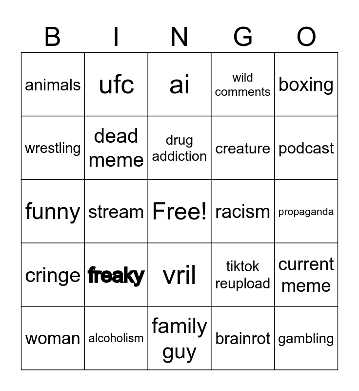 This bingo card has a free space and 24 words: freaky, alcoholism, drug addiction, woman, boxing, animals, wrestling, ufc, racism, vril, creature, funny, tiktok reupload, current meme, dead meme, brainrot, propaganda, ai, podcast, stream, gambling, cringe, wild comments and family guy.