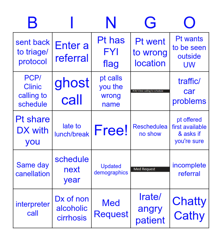 This bingo card has 3 images, a free space and 24 words: Med Request, PCP/ Clinic calling to schedule, Pt has FYI flag, Enter a referral, Same day canellation, Reschedulea no show, incomplete referral, Pt share DX with you, Pt went to wrong location, interpreter call, Dx of non alcoholic cirrhosis, traffic/ car problems, referral sent to wrong dept, ghost call, pt calls you the wrong name, schedule next year, sent back to triage/ protocol, pt offered first available & asks if you're sure, Irate/ angry patient, late to lunch/break, Chatty Cathy, Updated demographics, Pt wants to be seen outside UW and Pt from another state.