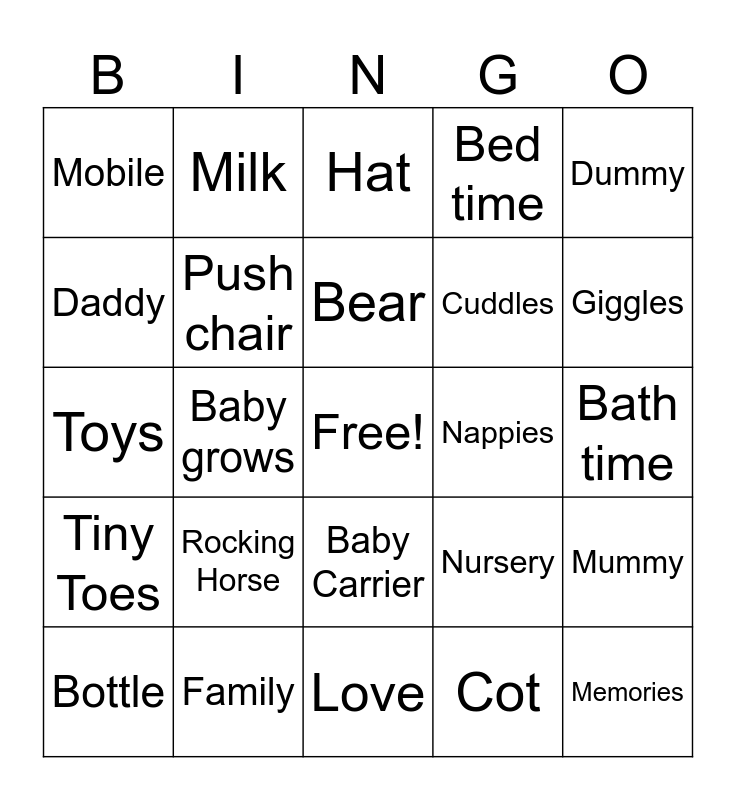 This bingo card has a free space and 24 words: Bottle, Rocking Horse, Bear, Cot, Dummy, Mobile, Milk, Hat, Nappies, Bath time, Toys, Push chair, Nursery, Mummy, Daddy, Family, Love, Bed time, Giggles, Tiny Toes, Baby grows, Baby Carrier, Cuddles and Memories.