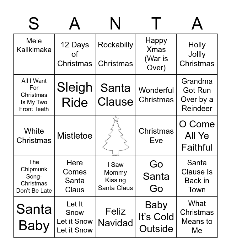 This bingo card has a free space and 56 words: Jingle Bell Rock, Santa Baby, Run Rudolph Run, Mele Kalikimaka, Feliz Navidad, Rockin’ Around the Christmas Tree, Sleigh Ride, Blue Christmas, Wonderful Christmas, Little Saint Nick, Happy Xmas (War is Over), Step Into Christmas, Please Come Home for Christmas, Rockin’ on Top of the World, Santa Looked a Lot Like Daddy, Pretty Paper, Holly Jollly Christmas, Mistletoe, I’m Getting’ Nuttin’ for Christmas, What Christmas Means to Me, Christmas Eve, Santa’s Messin’ With the Kid, Go Santa Go, Rockabilly Christmas, Jingle Bells, Santa Clause, Honky Tonk Christmas, Silver Belles, Grandma Got Run Over by a Reindeer, Dominick the Donkey, Do You Hear What I Hear, Silent Night, Santa Clause is Coming To Town, Frosty the Snowman, O Come All Ye Faithful, All I Want For Christmas Is My Two Front Teeth, White Christmas, I Want A Hippopotamus for Christmas, The Chipmunk Song- Christmas Don’t Be Late, 12 Days of Christmas, I Saw Mommy Kissing Santa Claus, The Little Drummer Boy, Merry Christmas Darling, The Christmas Song, Rudolph The Red-Nose Reindeer, Here Comes Santa Claus, Let It Snow Let it Snow Let it Snow, Winter Wonderland, Christmas- Baby Please Come Home, Last Christmas, Baby It’s Cold Outside, Please Daddy Don’t Get Drunk This Christmas, All I Want For Christmas is You, Deck the Halls, Santa Clause Is Back in Town and Reggae Reggae Christmas.