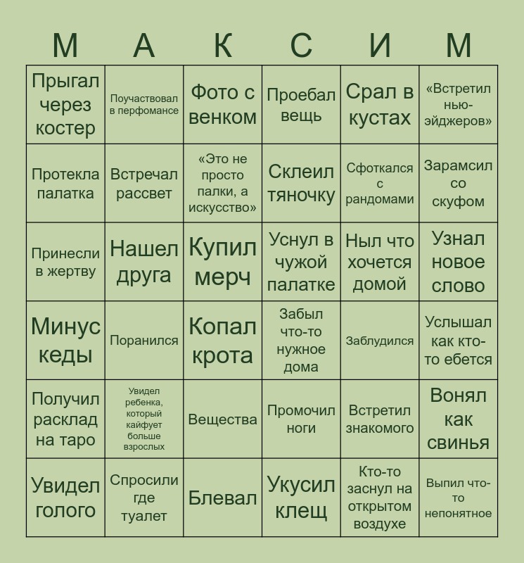 This bingo card has 36 words: Промочил ноги, Вещества, Укусил клещ, Протекла палатка, Минус кеды, Уснул в чужой палатке, Встречал рассвет, Блевал, Срал в кустах, Встретил знакомого, Зарамсил со скуфом, Проебал вещь, Вонял как свинья, Нашел друга, Склеил тяночку, Прыгал через костер, Получил расклад на таро, Ныл что хочется домой, Принесли в жертву, Фото с венком, Купил мерч, Поранился, Забыл что-то нужное дома, Копал крота, Заблудился, Поучаствовал в перфомансе, Сфоткался с рандомами, Спросили где туалет, «Это не просто палки, а искусство», «Встретил нью-эйджеров», Выпил что-то непонятное, Увидел голого, Услышал как кто-то ебется, Узнал новое слово, Увидел ребенка, который кайфует больше взрослых and Кто-то заснул на открытом воздухе.