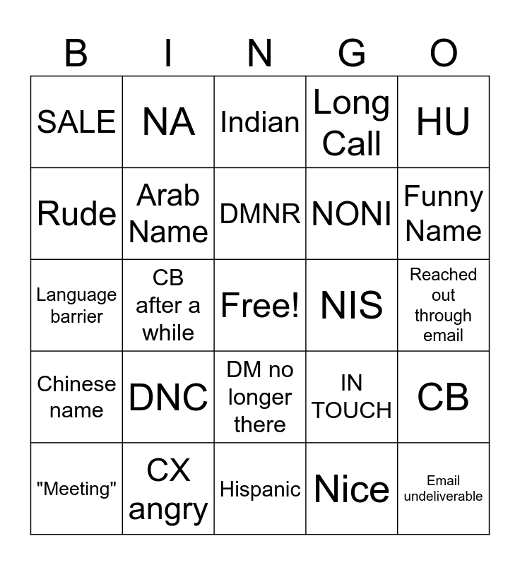 This bingo card has a free space and 24 words: DNC, CX angry, DMNR, "Meeting", HU, SALE, Rude, NA, NIS, DM no longer there, NONI, Language barrier, IN TOUCH, CB, Arab Name, Nice, Reached out through email, Indian, Funny Name, CB after a while, Email undeliverable, Chinese name, Long Call and Hispanic.