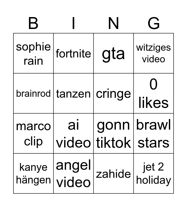 This bingo card has 16 words: angel video, brawl stars, gta, sophie rain, marco clip, fortnite, gonn tiktok, zahide, brainrod, tanzen, kanye hängen, witziges video, ai video, 0 likes, cringe and jet 2 holiday.