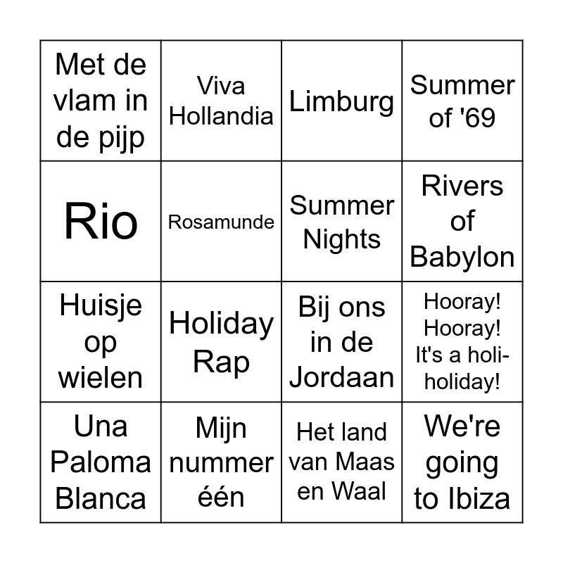 This bingo card has 32 words: Dag zuster Ursula, 't was aan de Costa del Sol, Hooray! Hooray! It's a holi- holiday!, Mexico, We're going to Ibiza, Summer Nights, Rio, Born in the U.S.A., Viva Hollandia, New York New York, Rivers of Babylon, Limburg, Brabantse nachten zijn lang, Europapa, Mijn nummer één, You're the greatest lover, Ik wil naar Griekenland, Bij ons in de Jordaan, Bella Italia, Als de nacht verdwijnt, Ome Jan, Terug in de tijd, Het land van Maas en Waal, Take me home, country roads, Una Paloma Blanca, Summer of '69, Huisje op wielen, Rosamunde, Met de vlam in de pijp, Bestel Mar, Het laatste rondje and Holiday Rap.