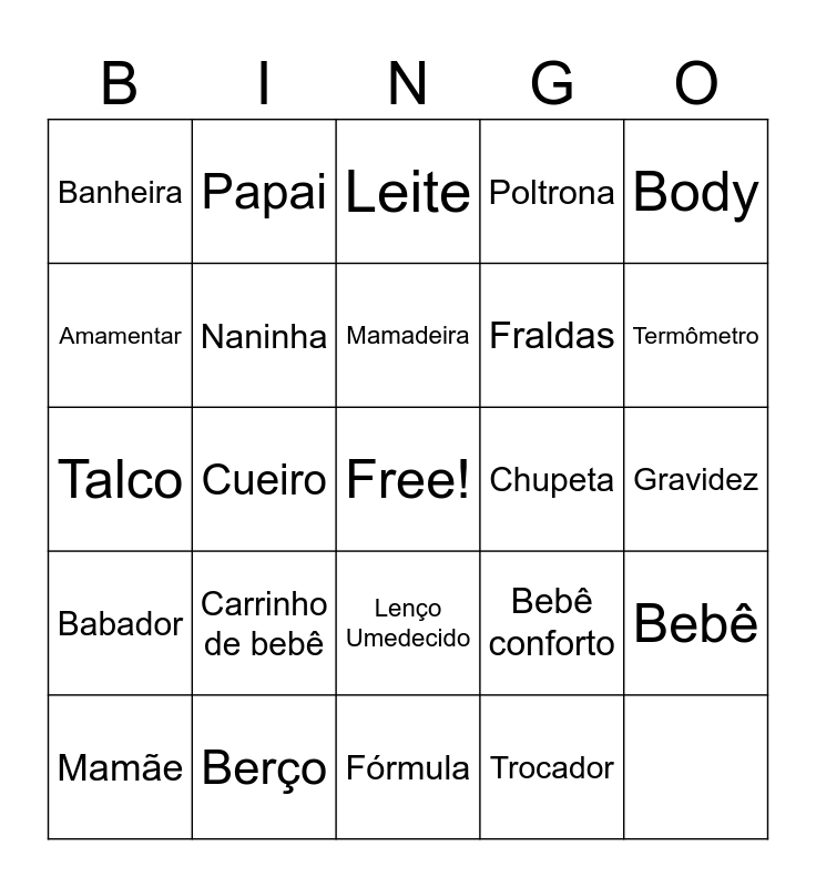 This bingo card has a free space and 24 words: Babador, Berço, Lenço Umedecido, Bebê conforto, Body, Banheira, Papai, Leite, Fraldas, Bebê, Amamentar, Naninha, Pomada para assadura, Chupeta, Termômetro, Mamãe, Cueiro, Mamadeira, Poltrona, Gravidez, Talco, Carrinho de bebê, Fórmula and Trocador.