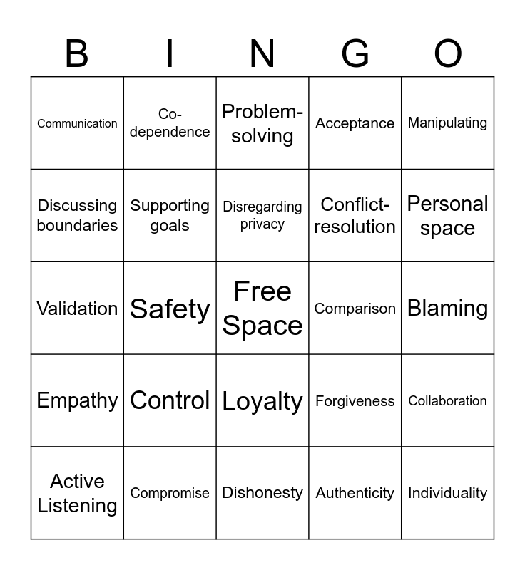 This bingo card has a free space and 29 words: Active Listening, Trust, Safety, Jealousy, Communication, Problem-solving, Supporting goals, Control, Comparison, Compromise, Blaming, Individuality, Dishonesty, Authenticity, Personal space, Sharing feelings, Loyalty, Empathy, Manipulating, Validation, Forgiveness, Gaslighting, Conflict-resolution, Discussing boundaries, Acceptance, Co-dependence, Collaboration, Disregarding privacy and Equality.