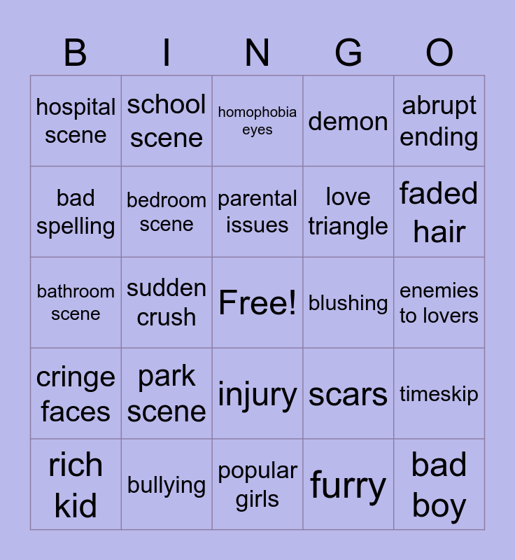 This bingo card has a free space and 24 words: park scene, bullying, parental issues, rich kid, abrupt ending, hospital scene, bad spelling, school scene, blushing, injury, love triangle, bathroom scene, scars, timeskip, bedroom scene, furry, enemies to lovers, homophobia eyes, faded hair, sudden crush, bad boy, cringe faces, demon and popular girls.