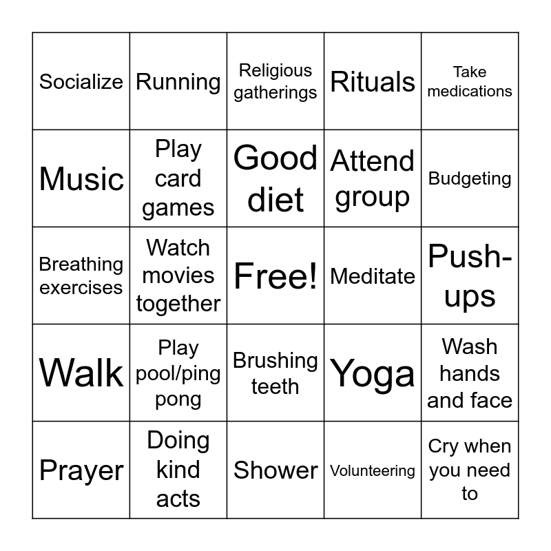 This bingo card has a free space and 24 words: Play pool/ping pong, Doing kind acts, Good diet, Prayer, Take medications, Socialize, Music, Running, Meditate, Brushing teeth, Attend group, Breathing exercises, Yoga, Wash hands and face, Play card games, Volunteering, Push-ups, Religious gatherings, Budgeting, Watch movies together, Cry when you need to, Walk, Rituals and Shower.