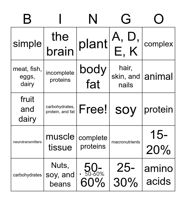 This bingo card has 1 images, a free space and 26 words: complete proteins, 25-30%, body fat, Nuts, soy, and beans, complex, simple, meat, fish, eggs, dairy, the brain, protein, macronutrients, hair, skin, and nails, fruit and dairy, 15-20%, carbohydrates, carbohydrates, protein, and fat, fat, A, D, E, K, neurotransmitters, plant, amino acids, animal, 50-60%, soy, muscle tissue, incomplete proteins and fiber, vitamins, minerals, phytochemicals, and water.