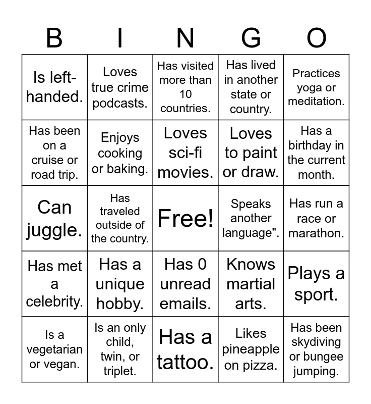 This bingo card has a free space and 38 words: Has a pet., Can play a musical instrument., Loves to read., Enjoys cooking or baking., Plays a sport., Has a unique hobby., Loves sci-fi movies., Is an early bird., Practices yoga or meditation., Loves to paint or draw., Has traveled outside of the country., Has lived in another state or country., Has been skydiving or bungee jumping., Has run a race or marathon., Has been on a cruise or road trip., Has met a celebrity., Has attended a music festival or concert., Has visited more than 10 countries., Has climbed a mountain., Speaks another language"., Is left-handed., Is an only child, twin, or triplet., Has a birthday in the current month., Is a vegetarian or vegan., Has a hidden talent., Has a tattoo., Has a favorite childhood memory they cherish., Has worked at the company for over 5 years., Has worked in another industry., Prefers remote work or working in the office., Has a work playlist., Has 0 unread emails., Likes pineapple on pizza., Loves true crime podcasts., Can do a cartwheel., Knows martial arts., Can juggle. and Has a funny travel story..
