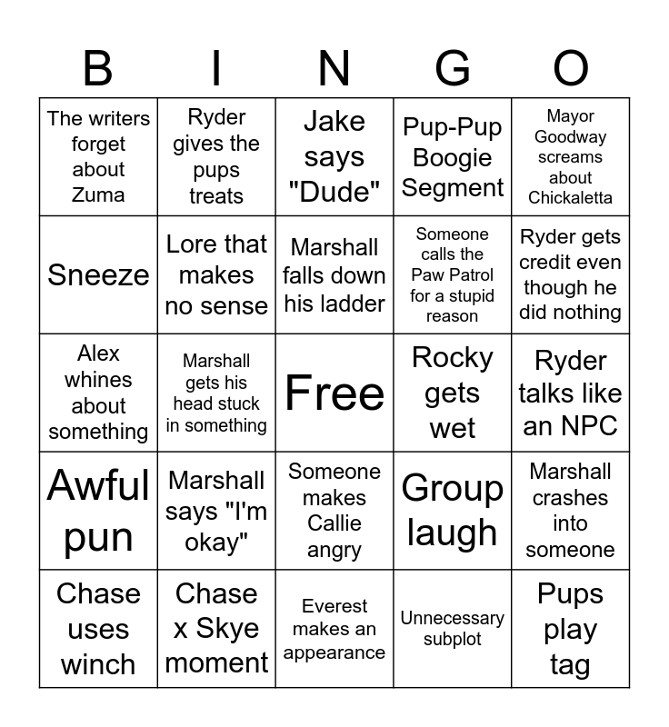 This bingo card has a free space and 24 words: Marshall says "I'm okay", Chase x Skye moment, Marshall falls down his ladder, Chase uses winch, Mayor Goodway screams about Chickaletta, The writers forget about Zuma, Sneeze, Ryder gives the pups treats, Rocky gets wet, Someone makes Callie angry, Someone calls the Paw Patrol for a stupid reason, Alex whines about something, Group laugh, Marshall crashes into someone, Lore that makes no sense, Unnecessary subplot, Ryder talks like an NPC, Jake says "Dude", Ryder gets credit even though he did nothing, Marshall gets his head stuck in something, Pups play tag, Awful pun, Pup-Pup Boogie Segment and Everest makes an appearance.