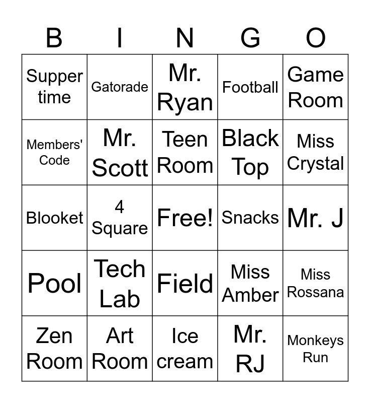 This bingo card has a free space and 24 words: Tech Lab, Art Room, Teen Room, Zen Room, Game Room, Supper time, Members' Code, Gatorade, Snacks, Field, Black Top, Blooket, Miss Amber, Miss Rossana, Mr. Scott, Mr. RJ, Mr. J, Mr. Ryan, Miss Crystal, 4 Square, Monkeys Run, Pool, Football and Ice cream.