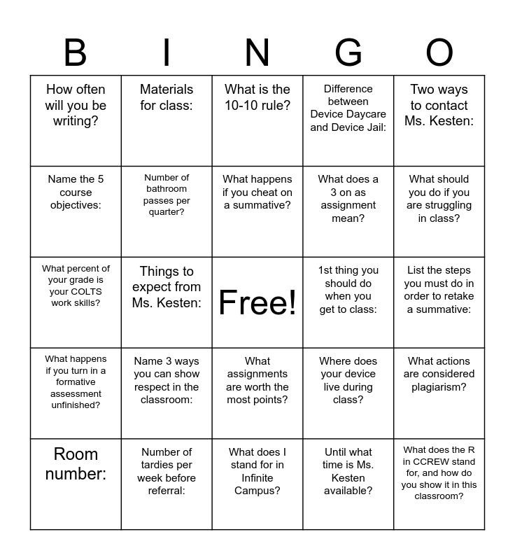 This bingo card has a free space and 24 words: Name 3 ways you can show respect in the classroom:, Number of tardies per week before referral:, What happens if you cheat on a summative?, Room number:, Two ways to contact Ms. Kesten:, How often will you be writing?, Name the 5 course objectives:, Materials for class:, 1st thing you should do when you get to class:, What assignments are worth the most points?, What does a 3 on as assignment mean?, What percent of your grade is your COLTS work skills?, Where does your device live during class?, What actions are considered plagiarism?, Number of bathroom passes per quarter?, Until what time is Ms. Kesten available?, List the steps you must do in order to retake a summative:, What is the 10-10 rule?, What should you do if you are struggling in class?, Things to expect from Ms. Kesten:, What does the R in CCREW stand for, and how do you show it in this classroom?, What happens if you turn in a formative assessment unfinished?, Difference between Device Daycare and Device Jail: and What does I stand for in Infinite Campus?.
