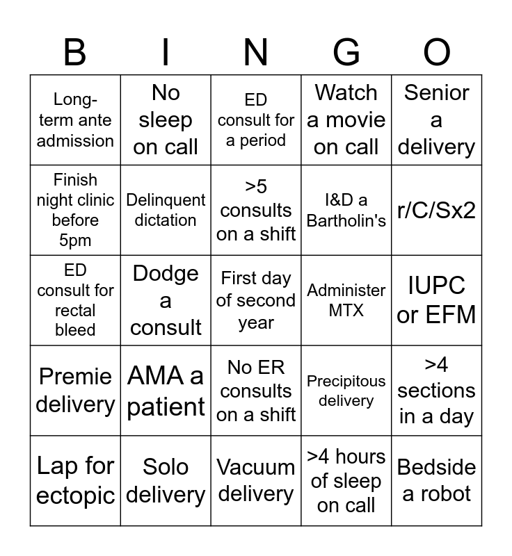This bingo card has a free space and 24 words: AMA a patient, Solo delivery, >5 consults on a shift, Lap for ectopic, Senior a delivery, Long-term ante admission, Finish night clinic before 5pm, No sleep on call, Administer MTX, No ER consults on a shift, I&D a Bartholin's, ED consult for rectal bleed, Precipitous delivery, >4 sections in a day, Delinquent dictation, >4 hours of sleep on call, IUPC or EFM, ED consult for a period, r/C/Sx2, Dodge a consult, Bedside a robot, Premie delivery, Watch a movie on call and Vacuum delivery.