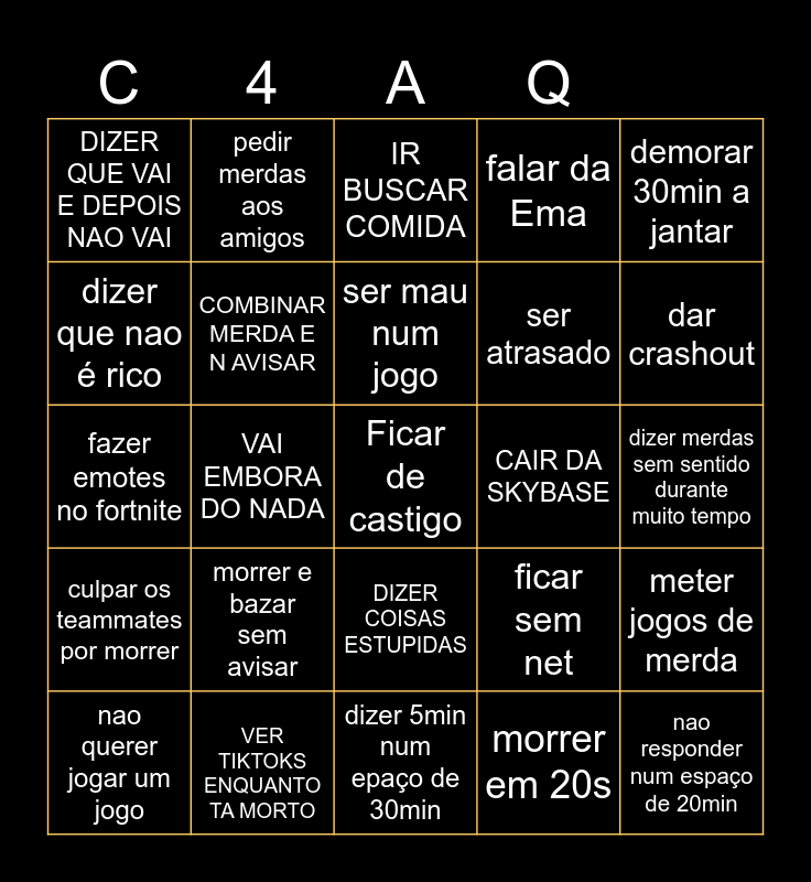This bingo card has 30 words: VER TIKTOKS ENQUANTO TA MORTO, DESLIGA O MICRO DO NADA, VAI EMBORA DO NADA, MENTIR AOS AMIGOS, DIZER QUE VAI E DEPOIS NAO VAI, IR BUSCAR COMIDA, COMBINAR MERDA E N AVISAR, DIZER COISAS ESTUPIDAS, CAIR DA SKYBASE, dizer 5min num epaço de 30min, dizer merdas sem sentido durante muito tempo, Ficar de castigo, morrer em 20s, nao responder num espaço de 20min, dar crashout, ser um raige bait, ficar sem net, culpar os teammates por morrer, morrer e bazar sem avisar, demorar 30min a jantar, fazer emotes no fortnite, dizer que vai dormir e manda tiktoks as 3 da manha, pedir merdas aos amigos, ser atrasado, dizer que nao é rico, falar da Ema, meter jogos de merda, nao querer jogar um jogo, ser mau num jogo and reclamar com os pais.