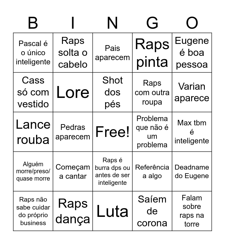 This bingo card has a free space and 24 words: Começam a cantar, Raps dança, Shot dos pés, Raps não sabe cuidar do próprio business, Eugene é boa pessoa, Pascal é o único inteligente, Cass só com vestido, Raps solta o cabelo, Problema que não é um problema, Raps é burra dps ou antes de ser inteligente, Raps com outra roupa, Lance rouba, Referência a algo, Deadname do Eugene, Lore, Saíem de corona, Max tbm é inteligente, Pais aparecem, Varian aparece, Pedras aparecem, Falam sobre raps na torre, Alguém morre/preso/ quase morre, Raps pinta and Luta.