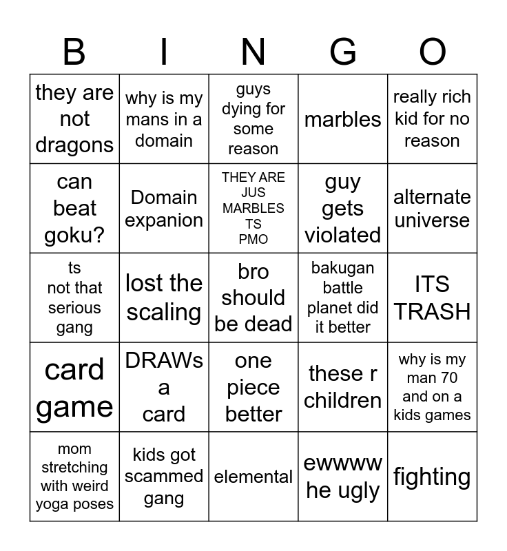 This bingo card has a free space and 24 words: DRAWs a card, kids got scammed gang, THEY ARE JUS MARBLES TS PMO, mom stretching with weird yoga poses, really rich kid for no reason, they are not dragons, can beat goku?, why is my mans in a domain, bakugan battle planet did it better, one piece better, guy gets violated, ts not that serious gang, these r children, why is my man 70 and on a kids games, Domain expanion, ewwww he ugly, ITS TRASH, guys dying for some reason, alternate universe, lost the scaling, fighting, card game, marbles and elemental.