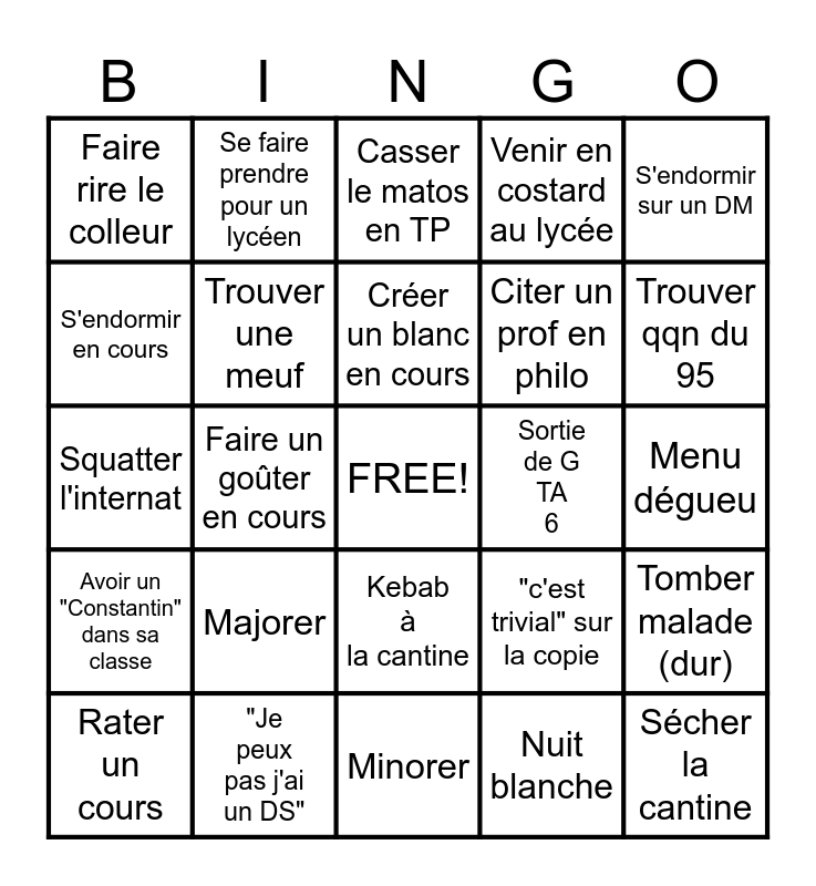 This bingo card has a free space and 24 words: Majorer, "Je peux pas j'ai un DS", Créer un blanc en cours, Rater un cours, S'endormir sur un DM, Faire rire le colleur, S'endormir en cours, Se faire prendre pour un lycéen, Sortie de GTA 6, Kebab à la cantine, Citer un prof en philo, Squatter l'internat, "c'est trivial" sur la copie, Tomber malade (dur), Trouver une meuf, Nuit blanche, Menu dégueu, Casser le matos en TP, Trouver qqn du 95, Faire un goûter en cours, Sécher la cantine, Avoir un "Constantin" dans sa classe, Venir en costard au lycée and Minorer.