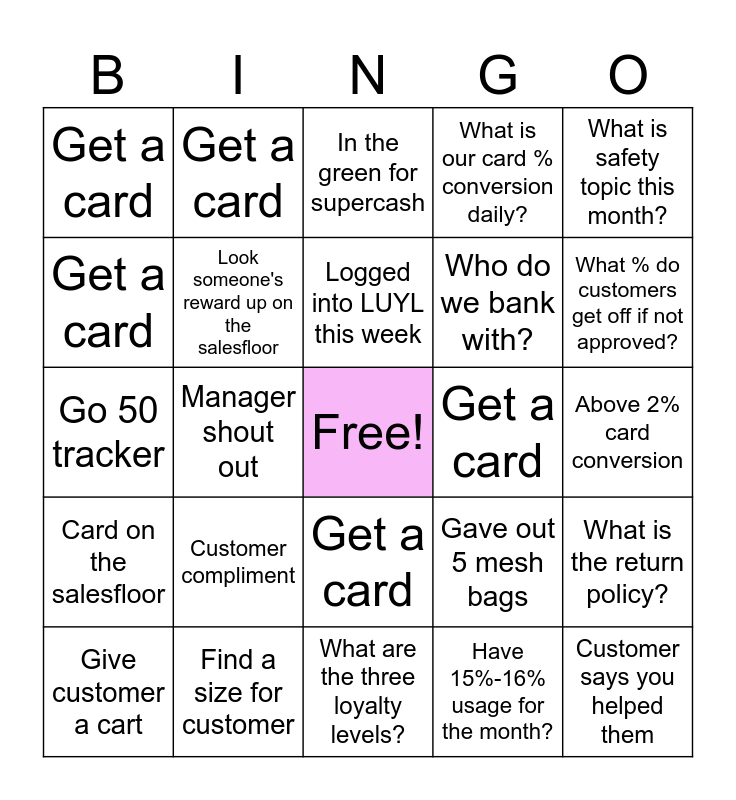 This bingo card has a free space and 24 words: Customer compliment, Find a size for customer, Logged into LUYL this week, Give customer a cart, What is safety topic this month?, Get a card, Get a card, Get a card, Get a card, Get a card, Who do we bank with?, Go 50 tracker, Gave out 5 mesh bags, What is the return policy?, Look someone's reward up on the salesfloor, Have 15%-16% usage for the month?, Above 2% card conversion, In the green for supercash, What % do customers get off if not approved?, Manager shout out, Customer says you helped them, Card on the salesfloor, What is our card % conversion daily? and What are the three loyalty levels?.