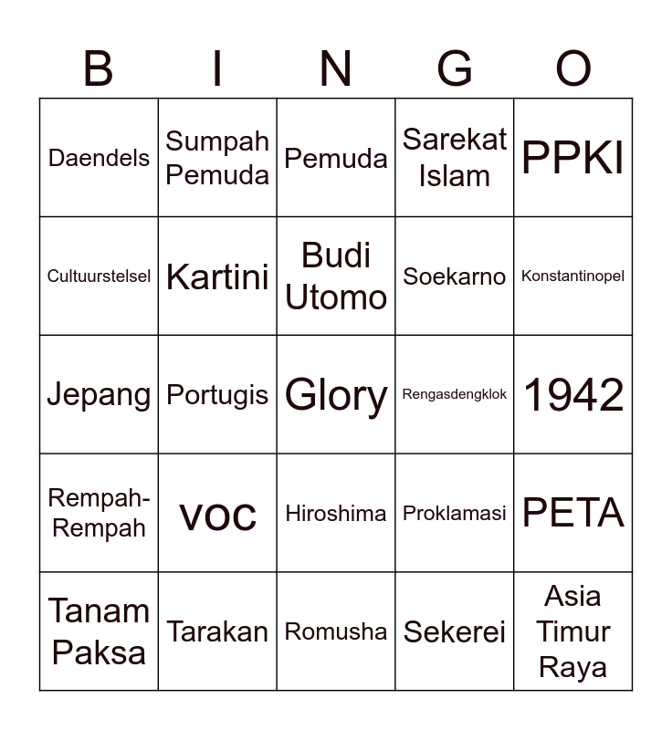 This bingo card has 25 words: voc, Romusha, Budi Utomo, Tanam Paksa, PPKI, Daendels, Cultuurstelsel, Sumpah Pemuda, Rengasdengklok, Hiroshima, Soekarno, Jepang, Proklamasi, PETA, Kartini, Asia Timur Raya, 1942, Pemuda, Konstantinopel, Portugis, Glory, Tarakan, Rempah-Rempah, Sarekat Islam and Sekerei.