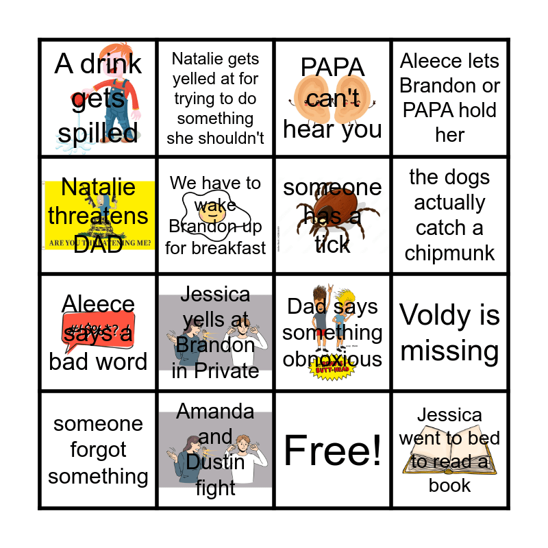 This bingo card has 10 images and 16 words: Amanda and Dustin fight, Voldy is missing, PAPA can't hear you, A drink gets spilled, Aleece says a bad word, Natalie gets yelled at for trying to do something she shouldn't, Dad says something obnoxious, Free!, Natalie threatens DAD, We have to wake Brandon up for breakfast, someone forgot something, Aleece lets Brandon or PAPA hold her, Jessica yells at Brandon in Private, the dogs actually catch a chipmunk, someone has a tick and Jessica went to bed to read a book.