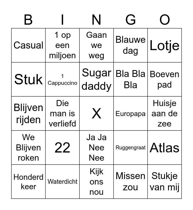 This bingo card has a free space and 29 words: Honderd keer, Ik zing, Die man is verliefd, Blijven slapen, Casual, Gaan we weg, 1 Cappuccino, 22, Europapa, Waterdicht, Huisje aan de zee, Stukje van mij, Kijk ons nou, Missen zou, Boeven pad, Wiegelied, Ja Ja Nee Nee, We Blijven roken, Lotje, Blijven rijden, Ruggengraat, Noodgeval, Bla Bla Bla, Stuk, Blauwe dag, 1 op een miljoen, Atlas, Sugar daddy and Ken je dat gevoel.