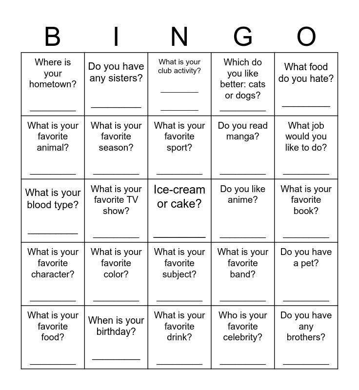This bingo card has a free space and 24 words: What is your favorite color? _________, When is your birthday? _________, What is your favorite sport? _________, What is your favorite food? _________, What food do you hate? _________, Where is your hometown? _________, What is your favorite animal? _________, Do you have any sisters? _________, Do you like anime? _________, What is your favorite subject? _________, Do you read manga? _________, What is your blood type? _________, What is your favorite band? _________, Do you have a pet? _________, What is your favorite season? _________, Who is your favorite celebrity? _________, What is your favorite book? _________, What is your club activity? _________ _________, What job would you like to do? _________, What is your favorite TV show? _________, Do you have any brothers? _________, What is your favorite character? _________, Which do you like better: cats or dogs? _________ and What is your favorite drink? _________.