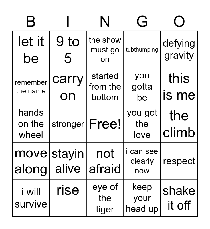 This bingo card has a free space and 29 words: i will survive, survivor, stronger, don't stop believing, let it be, the show must go on, carry on, stayin alive, you got the love, rise, the climb, shake it off, eye of the tiger, keep your head up, this is me, carry on, not afraid, move along, defying gravity, hands on the wheel, i can see clearly now, it's not over yet, you gotta be, remember the name, tubthumping, 9 to 5, respect, started from the bottom and ain't no mountain high enough.