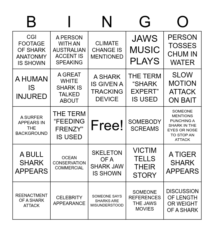 This bingo card has a free space and 24 words: OCEAN CONSERVATION COMMERCIAL, CELEBRITY APPEARANCE, A SHARK IS GIVEN A TRACKING DEVICE, REENACTMENT OF A SHARK ATTACK, PERSON TOSSES CHUM IN WATER, CGI FOOTAGE OF SHARK ANATONMY IS SHOWN, A HUMAN IS INJURED, A PERSON WITH AN AUSTRALIAN ACCENT IS SPEAKING, SOMEBODY SCREAMS, SKELETON OF A SHARK JAW IS SHOWN, THE TERM “SHARK EXPERT” IS USED, A SURFER APPEARS IN THE BACKGROUND, VICTIM TELLS THEIR STORY, A TIGER SHARK APPEARS, A GREAT WHITE SHARK IS TALKED ABOUT, SOMEONE REFERENCES THE JAWS MOVIES, SOMEONE MENTIONS PUNCHING A SHARK IN THE EYES OR NOSE TO STOP AN ATTACK, CLIMATE CHANGE IS MENTIONED, SLOW MOTION ATTACK ON BAIT, THE TERM “FEEDING FRENZY” IS USED, DISCUSSION OF LENGTH OR WEIGHT OF A SHARK, A BULL SHARK APPEARS, JAWS MUSIC PLAYS and SOMEONE SAYS SHARKS ARE MISUNDERSTOOD.