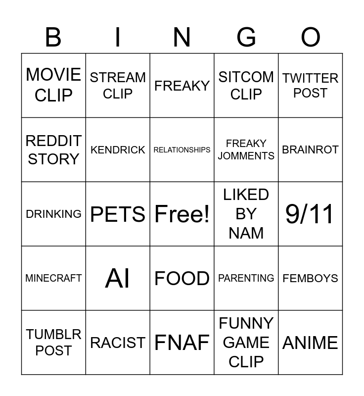 This bingo card has a free space and 24 words: AI, RACIST, RELATIONSHIPS, TUMBLR POST, TWITTER POST, MOVIE CLIP, REDDIT STORY, STREAM CLIP, LIKED BY NAM, FOOD, FREAKY JOMMENTS, DRINKING, PARENTING, FEMBOYS, KENDRICK, FUNNY GAME CLIP, 9/11, FREAKY, BRAINROT, PETS, ANIME, MINECRAFT, SITCOM CLIP and FNAF.