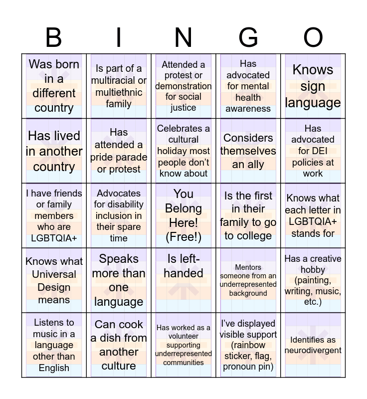 This bingo card has 24 images, a free space and 24 words: Speaks more than one language, Can cook a dish from another culture, Celebrates a cultural holiday most people don’t know about, Listens to music in a language other than English, Knows sign language, Was born in a different country, Has lived in another country, Is part of a multiracial or multiethnic family, Is the first in their family to go to college, Is left-handed, Considers themselves an ally, I have friends or family members who are LGBTQIA+, Mentors someone from an underrepresented background, Has a creative hobby (painting, writing, music, etc.), Has attended a pride parade or protest, I’ve displayed visible support (rainbow sticker, flag, pronoun pin), Knows what each letter in LGBTQIA+ stands for, Attended a protest or demonstration for social justice, Has advocated for DEI policies at work, Advocates for disability inclusion in their spare time, Identifies as neurodivergent, Knows what Universal Design means, Has advocated for mental health awareness and Has worked as a volunteer supporting underrepresented communities.