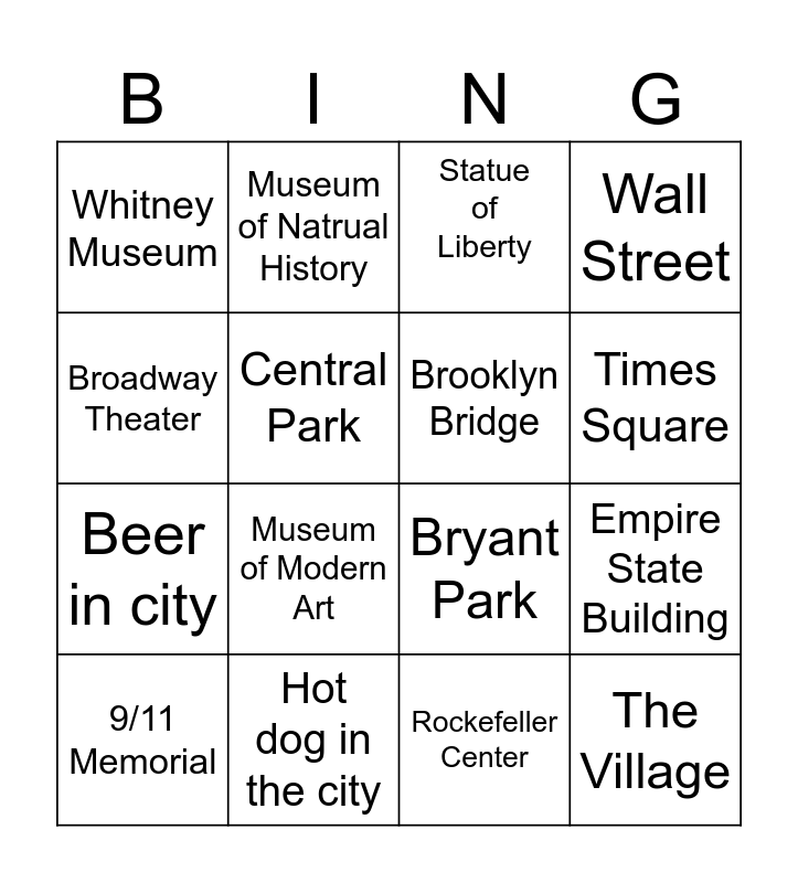 This bingo card has 16 words: Hot dog in the city, Empire State Building, Statue of Liberty, Whitney Museum, Beer in city, Museum of Natrual History, Bryant Park, Rockefeller Center, Broadway Theater, Central Park, 9/11 Memorial, Wall Street, Museum of Modern Art, Times Square, Brooklyn Bridge and The Village.