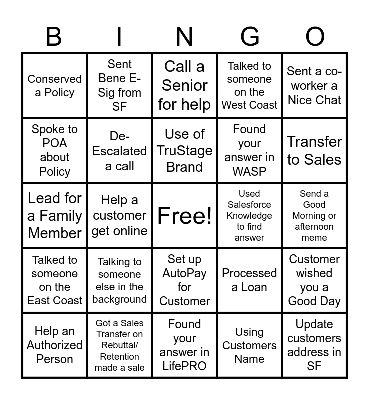 This bingo card has a free space and 24 words: Talking to someone else in the background, Got a Sales Transfer on Rebuttal/ Retention made a sale, Use of TruStage Brand, Help an Authorized Person, Sent a co-worker a Nice Chat, Conserved a Policy, Spoke to POA about Policy, Sent Bene E-Sig from SF, Used Salesforce Knowledge to find answer, Set up AutoPay for Customer, Found your answer in WASP, Lead for a Family Member, Processed a Loan, Customer wished you a Good Day, De-Escalated a call, Using Customers Name, Send a Good Morning or afternoon meme, Call a Senior for help, Transfer to Sales, Help a customer get online, Update customers address in SF, Talked to someone on the East Coast, Talked to someone on the West Coast and Found your answer in LifePRO.