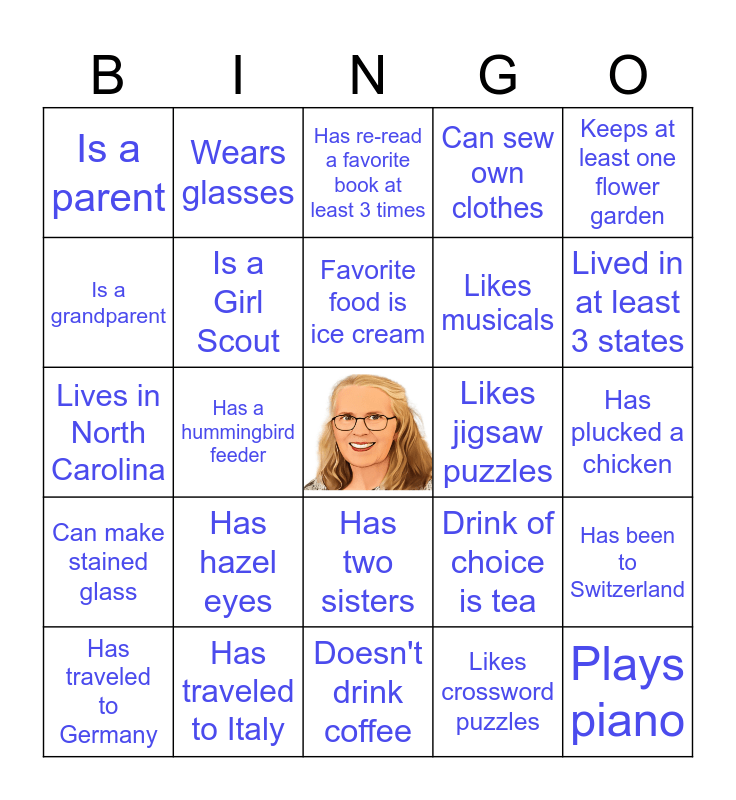 This bingo card has a free space and 34 words: Has a birthday in September, Likes crossword puzzles, Can tango, Can crochet, Can make stained glass, Is a Girl Scout, Keeps at least one flower garden, Has traveled to Germany, Wears glasses, Played basketball in high school, Favorite food is ice cream, Has re-read a favorite book at least 3 times, Lives in Mebane, Can waltz, Likes jigsaw puzzles, Lived in at least 3 states, Has traveled to Italy, Lives in North Carolina, Has hazel eyes, Drink of choice is tea, Has two sisters, Has traveled to England, Is a parent, Has plucked a chicken, Doesn't drink coffee, Plays piano, Can sew own clothes, Doesn't like turnips, Likes musicals, Is a grandparent, Has a bird feeder, Has a hummingbird feeder, Has been to Switzerland and Has been to Europe.