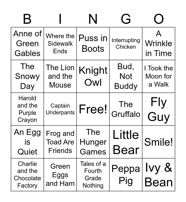 This bingo card has a free space and 24 words: Frog and Toad Are Friends, Green Eggs and Ham, Knight Owl, Charlie and the Chocolate Factory, A Wrinkle in Time, Anne of Green Gables, The Snowy Day, Where the Sidewalk Ends, The Gruffalo, The Hunger Games, Bud, Not Buddy, Harold and the Purple Crayon, Little Bear, Smile!, The Lion and the Mouse, Peppa Pig, Fly Guy, Puss in Boots, I Took the Moon for a Walk, Captain Underpants, Ivy & Bean, An Egg is Quiet, Interrupting Chicken and Tales of a Fourth Grade Nothing.