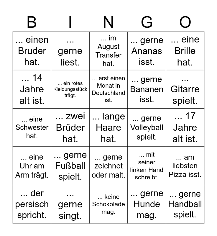This bingo card has a free space and 24 words: ... gerne Fußball spielt., ... gerne singt., ... erst einen Monat in Deutschland ist., ... der persisch spricht., ... eine Brille hat., ... einen Bruder hat., ... 14 Jahre alt ist., ... gerne liest., ... gerne Volleyball spielt., ... gerne zeichnet oder malt., ... gerne Bananen isst., ... eine Schwester hat., ... mit seiner linken Hand schreibt., ... am liebsten Pizza isst., ... ein rotes Kleidungsstück trägt., ... gerne Hunde mag., ... 17 Jahre alt ist., ... im August Transfer hat., ... Gitarre spielt., ... zwei Brüder hat., ... gerne Handball spielt., ... eine Uhr am Arm trägt., ... gerne Ananas isst. and ... keine Schokolade mag..