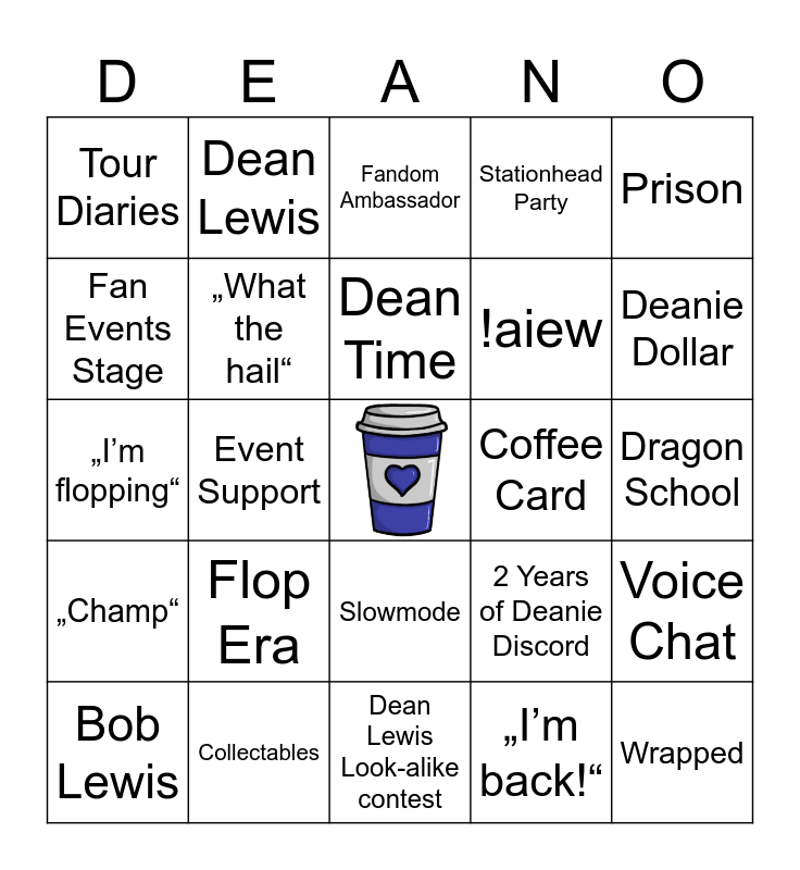 This bingo card has a free space and 34 words: Café de Deanies, „I’m back!“, „Goat“, „Tiger“, „Champ“, „What the hail“, Prison, Bob Lewis, Dean Lewis, Deanie Discord, Dean Time, Fandom Ambassador, Mod, Competition, Coffee Card, Deanie Dollar, Collectables, „I’m flopping“, Flop Era, 2 Years of Deanie Discord, Slowmode, Question of the week, Tour Diaries, Dragon School, Dean Lewis Look-alike contest, Wrapped, Stationhead Party, Easter Egg Hunt, !aiew, Fan Events Stage, ModMail, Event Support, Voice Chat and Server Tag.