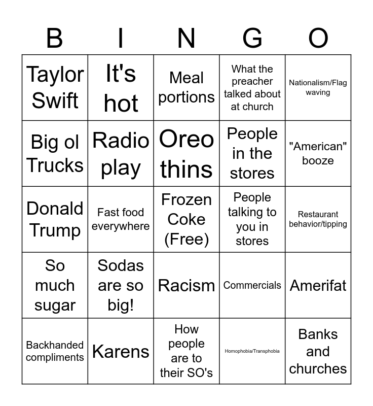 This bingo card has a free space and 24 words: Sodas are so big!, Karens, Oreo thins, Backhanded compliments, Nationalism/Flag waving, Taylor Swift, Big ol Trucks, It's hot, People talking to you in stores, Racism, People in the stores, Donald Trump, Commercials, Amerifat, Radio play, Homophobia/Transphobia, Restaurant behavior/tipping, Meal portions, "American" booze, Fast food everywhere, Banks and churches, So much sugar, What the preacher talked about at church and How people are to their SO's.