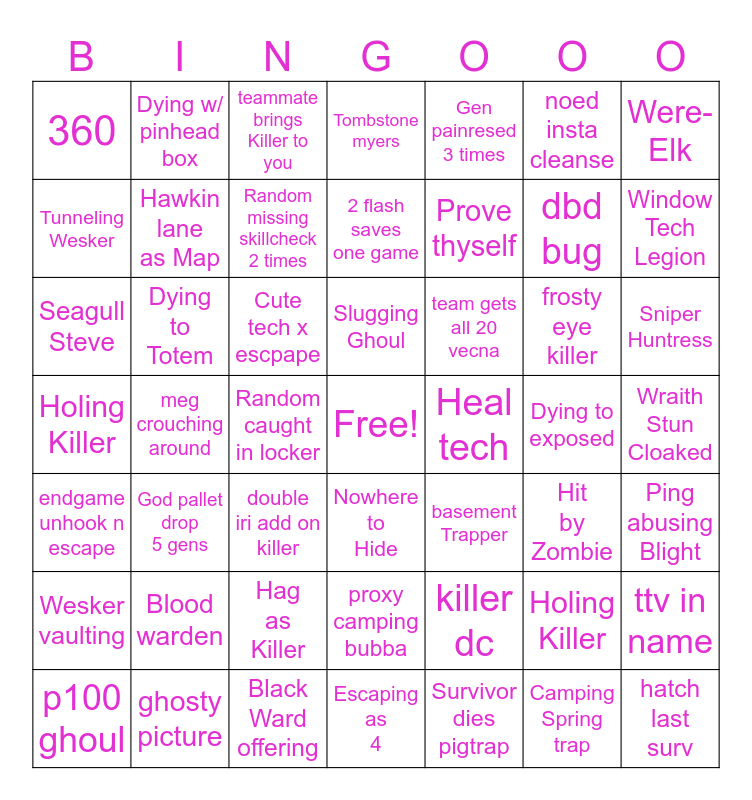 This bingo card has a free space and 48 words: killer dc, dbd bug, Escaping as 4, meg crouching around, Cute tech x escpape, Wraith Stun Cloaked, Dying w/ pinhead box, ghosty picture, noed insta cleanse, Nowhere to Hide, Were-Elk, Tombstone myers, frosty eye killer, team gets all 20 vecna, Wesker vaulting, Dying to exposed, Tunneling Wesker, Window Tech Legion, Holing Killer, Gen painresed 3 times, Prove thyself, Random caught in locker, 360, Hawkin lane as Map, ttv in name, Random missing skillcheck 2 times, Sniper Huntress, p100 ghoul, Slugging Ghoul, Dying to Totem, Camping Spring trap, Heal tech, Ping abusing Blight, Blood warden, Holing Killer, basement Trapper, Hit by Zombie, Seagull Steve, double iri add on killer, Hag as Killer, endgame unhook n escape, hatch last surv, teammate brings Killer to you, Black Ward offering, 2 flash saves one game, proxy camping bubba, God pallet drop 5 gens and Survivor dies pigtrap.