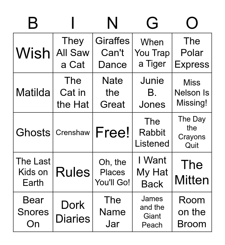 This bingo card has a free space and 24 words: Rules, Dork Diaries, Nate the Great, Bear Snores On, The Polar Express, Wish, Matilda, They All Saw a Cat, The Rabbit Listened, Oh, the Places You'll Go!, Junie B. Jones, Ghosts, I Want My Hat Back, The Mitten, The Cat in the Hat, James and the Giant Peach, The Day the Crayons Quit, Giraffes Can't Dance, Miss Nelson Is Missing!, Crenshaw, Room on the Broom, The Last Kids on Earth, When You Trap a Tiger and The Name Jar.