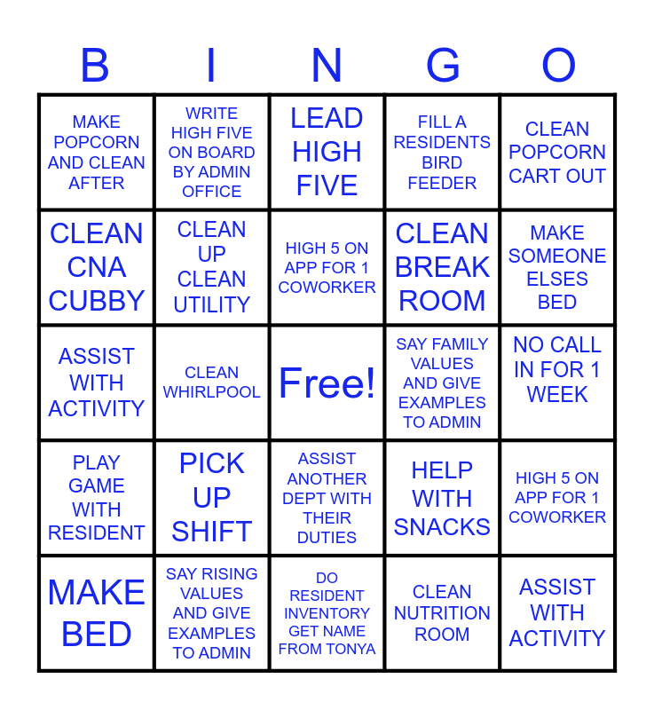 This bingo card has a free space and 24 words: MAKE BED, PICK UP SHIFT, HIGH 5 ON APP FOR 1 COWORKER, CLEAN NUTRITION ROOM, CLEAN POPCORN CART OUT, MAKE POPCORN AND CLEAN AFTER, WRITE HIGH FIVE ON BOARD BY ADMIN OFFICE, LEAD HIGH FIVE, SAY FAMILY VALUES AND GIVE EXAMPLES TO ADMIN, NO CALL IN FOR 1 WEEK, ASSIST WITH ACTIVITY, CLEAN UP CLEAN UTILITY, HELP WITH SNACKS, HIGH 5 ON APP FOR 1 COWORKER, CLEAN CNA CUBBY, SAY RISING VALUES AND GIVE EXAMPLES TO ADMIN, DO RESIDENT INVENTORY GET NAME FROM TONYA, FILL A RESIDENTS BIRD FEEDER, MAKE SOMEONE ELSES BED, PLAY GAME WITH RESIDENT, CLEAN WHIRLPOOL, ASSIST ANOTHER DEPT WITH THEIR DUTIES, CLEAN BREAK ROOM and ASSIST WITH ACTIVITY.
