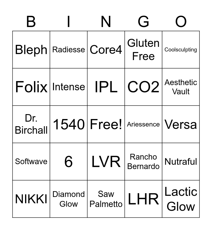This bingo card has a free space and 25 words: 6, Saw Palmetto, IPL, NIKKI, Coolsculpting, Bleph, Folix, Radiesse, Ariessence, LVR, CO2, Dr. Birchall, Rancho Bernardo, Nutraful, Intense, Upneeq, Versa, Core4, Aesthetic Vault, 1540, Lactic Glow, Diamond Glow, Softwave, Gluten Free and LHR.